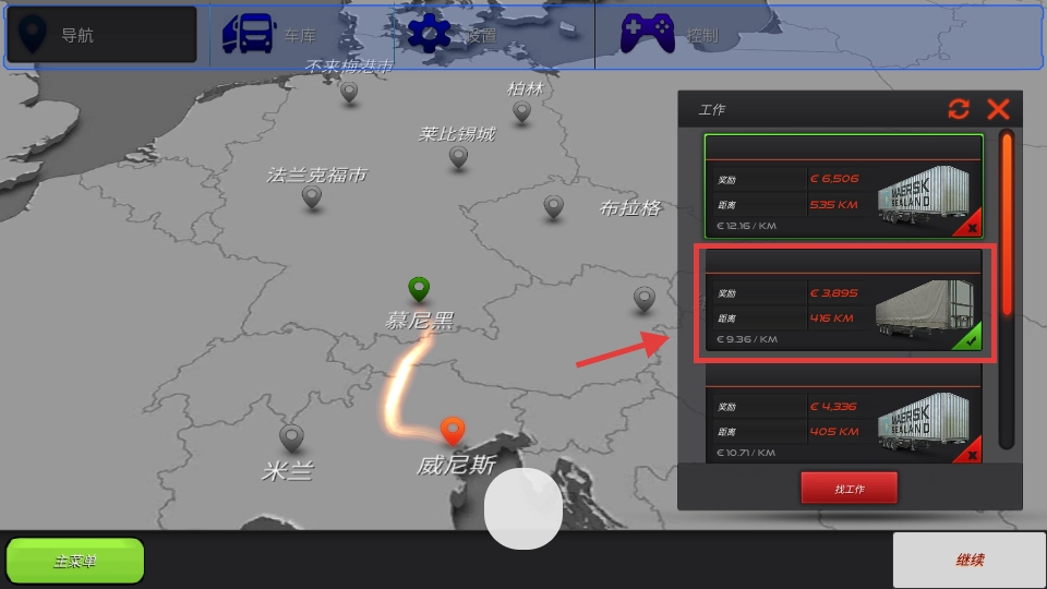 3、在任务列表选奖励【3895】欧元-距离【416】KM的任务,点击后开启运输之旅。