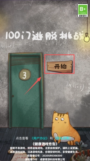 1、打开“100门逃脱挑战”的初始界面,找到右侧的木质“开始”按钮,轻轻点击它就能启动游戏并进入关卡。