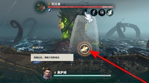 1、首先要指挥射击,在遭遇敌人如克拉肯时,按照提示拖拽相应位置,使船只发射炮击,以此对敌人造成伤害,开启战斗环节,应对航海中的威胁。