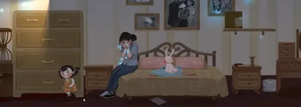 8、从梳妆台爬上去拿到兔子,把兔子放进中间的礼物盒子里,然后进入上方的空间。