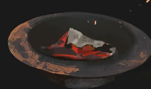 12、将刚得到的所有道具烧毁,爬上棺材触发剧情,火盆内有一张纸条,随后进入尾声。