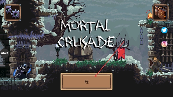 1、在《致命的行军骑士之剑》的主界面,点击中间的“玩”按钮就能进入游戏,开启这款像素风格冒险游戏的体验之旅,之后还可以借助界面上的功能进行设置或查看相关内容。