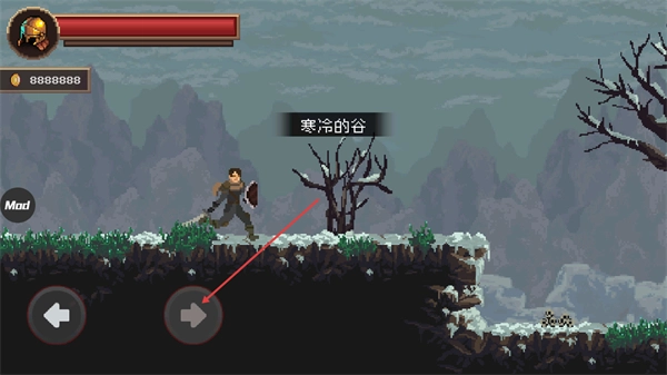 进入寒冷的谷场景后,通过左右方向按钮操控角色移动,在雪地与山地结合的关卡场景中探索,推进冒险流程,同时留意上方的资源与状态显示。