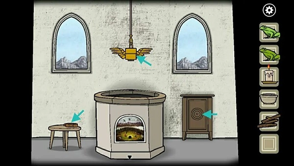 4、先去湖边捡些木柴,接着回到屋里拿走凳子上的腰带,然后转动屋内的机关轮盘,解开右侧柜子的锁,就能拿到蛙笛了。