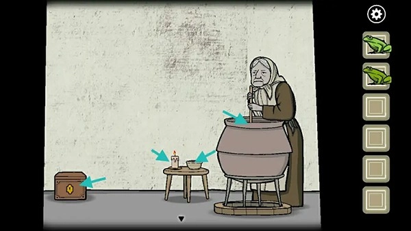 7、在小屋内放置木柴并用蜡烛点燃,将四只青蛙依次放入锅中煮成青蛙汤;