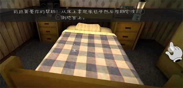 玩家需要操控主角移动,接着从床上拿起毯子,再借助毯子在地面上移动。
