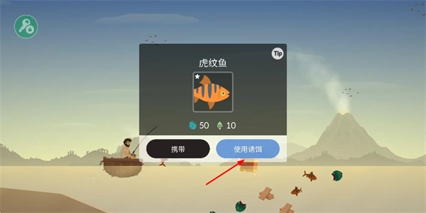 2、钓到庞纹鱼后、界面显示该鱼信息、点击使用诱饵按钮、辅助后续的钓鱼操作。