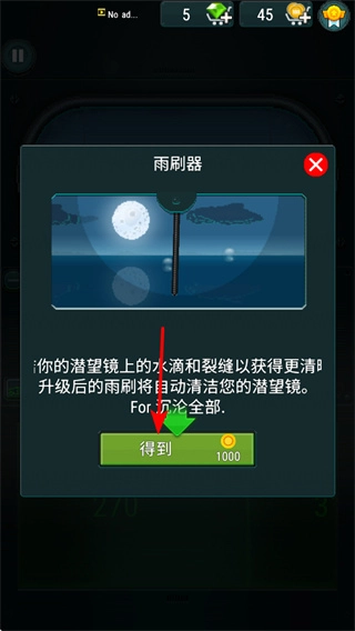 3、在雨刷器升级界面,点击得到按钮,消耗1000金币可升级雨刷器,升级后能自动清洁潜望镜。