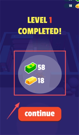 4、通关后会进入奖励结算界面,点击橙红色的"continue"按钮继续,此时可清晰查看本局获得的58张钞票与18根金条的具体奖励数额。