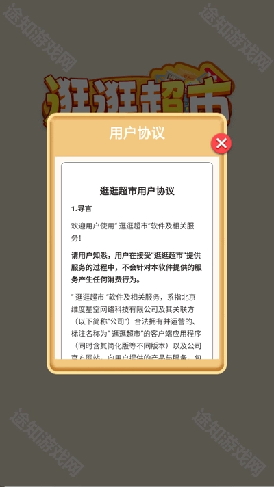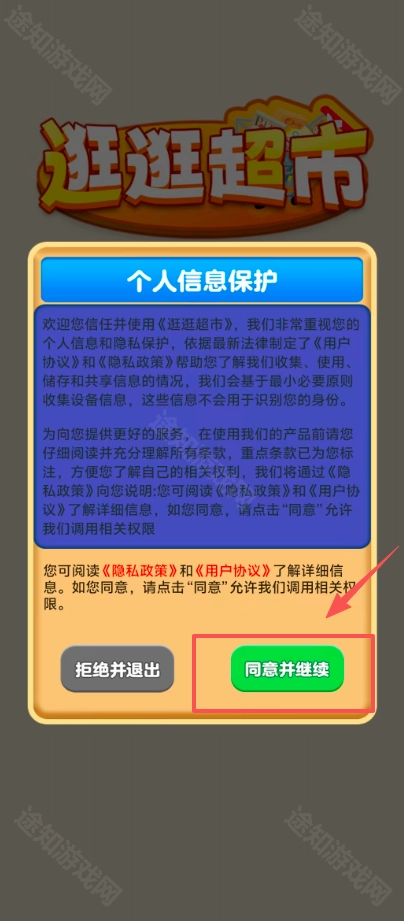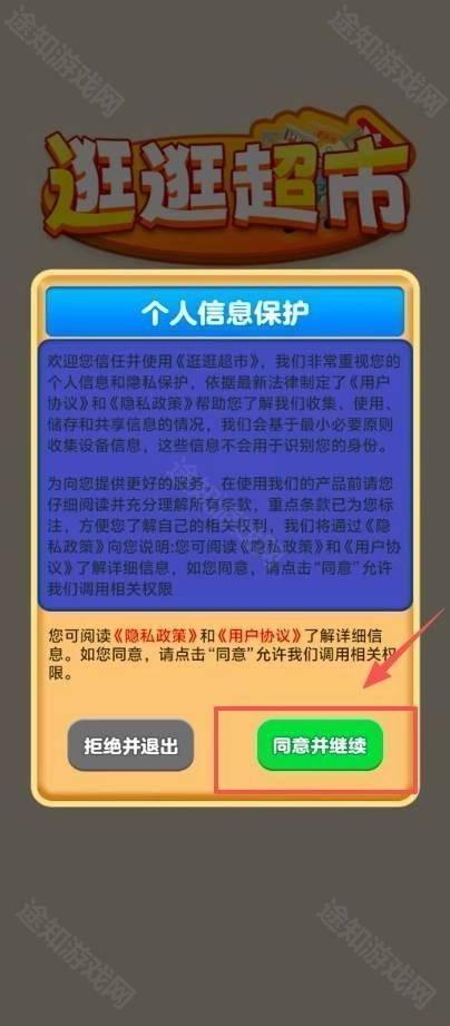 1、本页面点击按钮安装《逛逛超市》游戏,启动游戏进入,点击同意并继续!