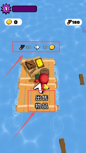 3、看到木筏上有180个物品和30换10的兑换比例时,点击出售物品区域把木材换成金币。