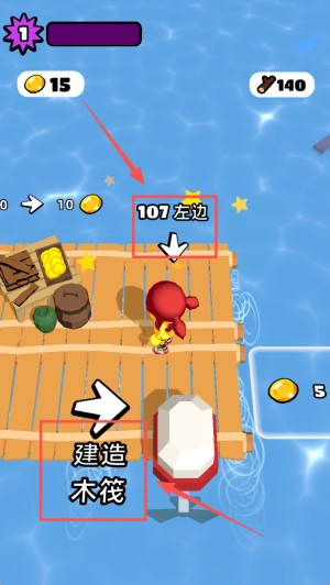 4、当左上角有15金币和140木柴时,点击右下角金币图标花5金币,或者点建造木筏箭头来扩建木筏。