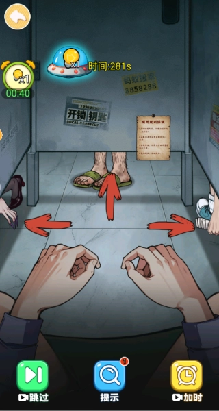 2、观察厕所隔间下露出的双脚及周围情况,结合规则和场景细节,分析哪个方向(箭头所指)存在异常或符合解谜逻辑。