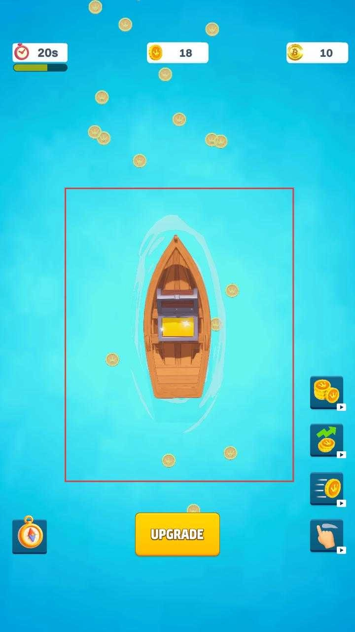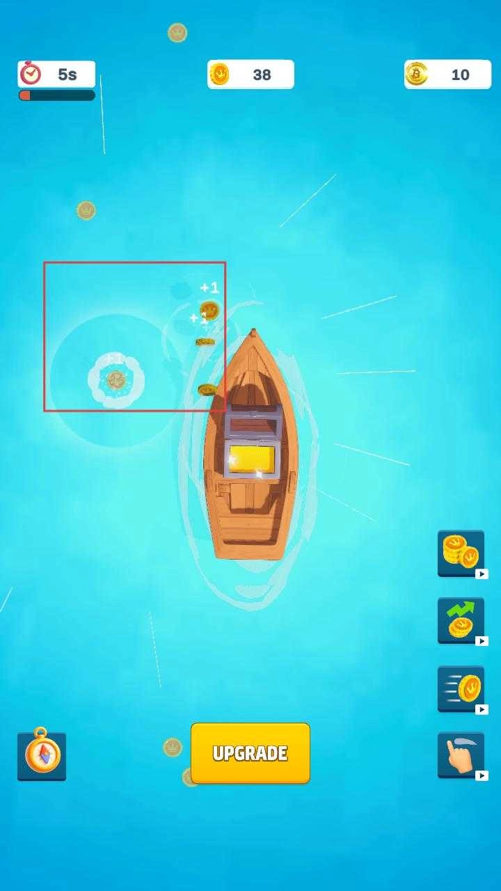 1、启动游戏后,操控小船在水面航行,收集周边的金币,与此同时要注意时间限制,在规定时间内尽量多收集金币。