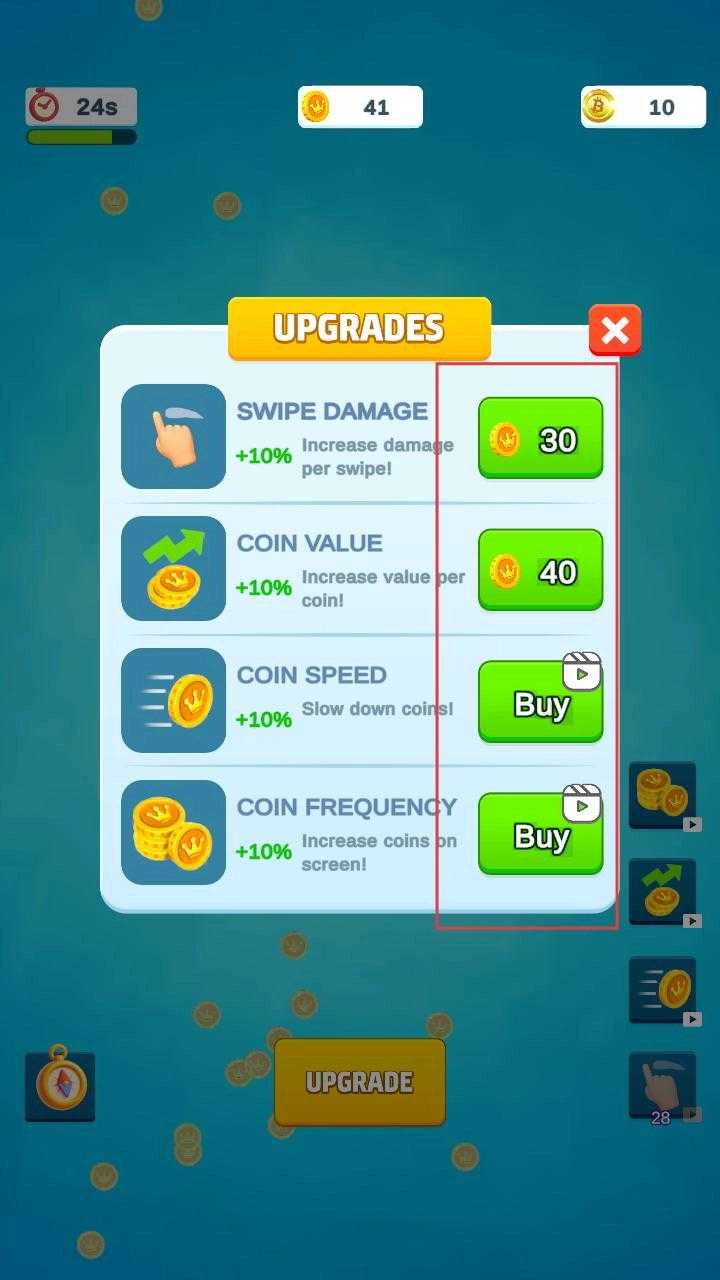 3、点击UPGRADE按钮,进入升级界面,可用收集的金币购买SWIPE DAMAGE、COIN VALUE等升级项,提升收集效率。