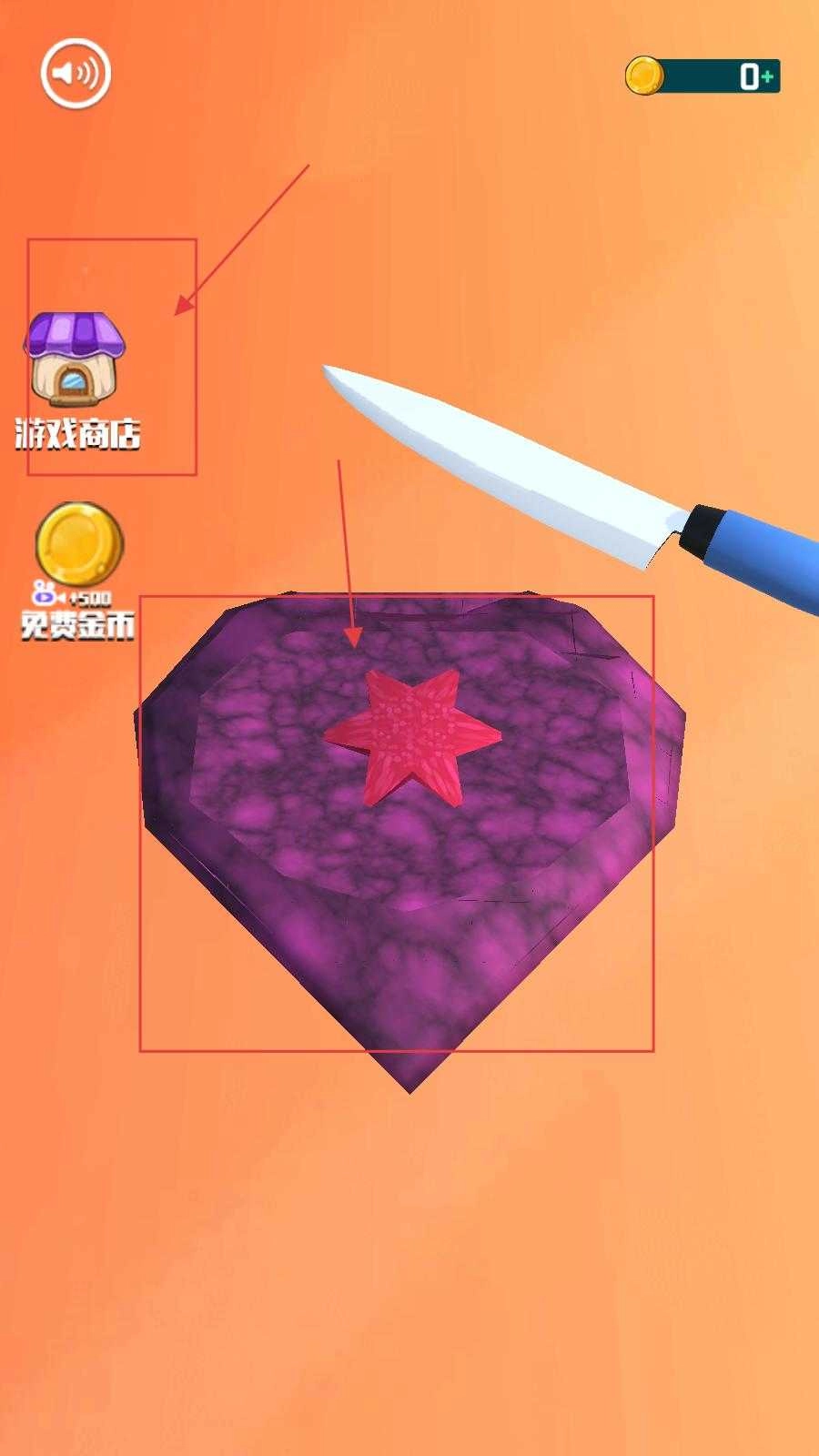 1、在游戏界面里,你可以进入游戏商店获取道具,还能领取免费金币,借助刀具切割带有红星的紫色物体,开启切割挑战。