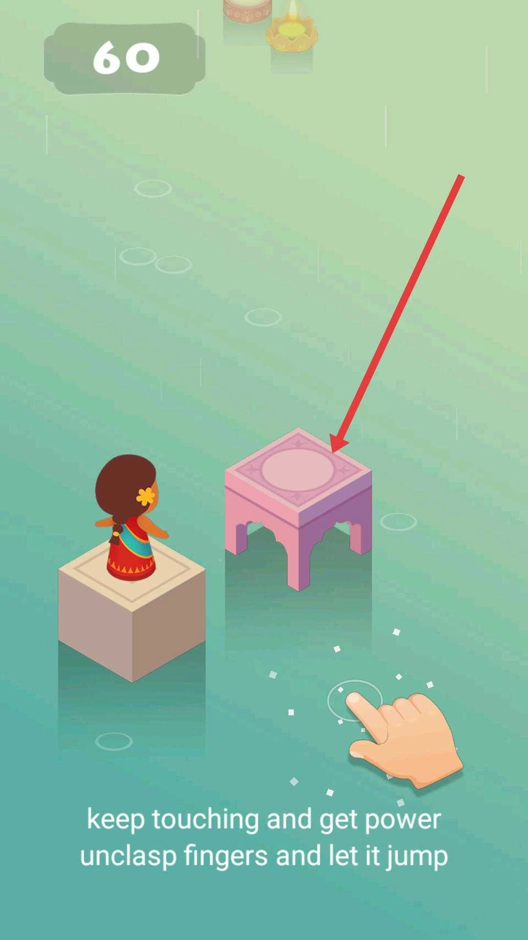 2、进入游戏后,根据提示长按屏幕积攒力量,然后松开手指,让游戏角色跳跃到下一个平台。