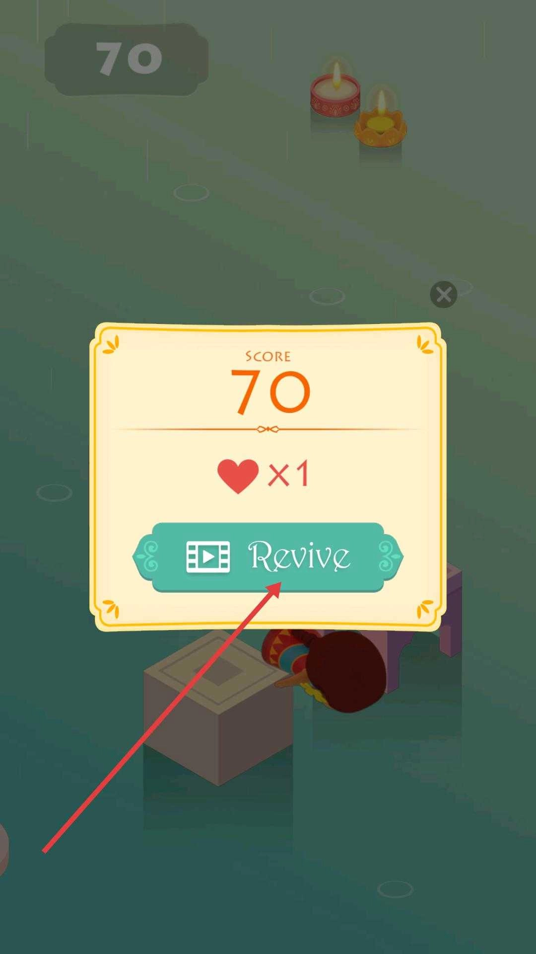 4、如果角色跳跃失败,会出现分数和复活提示界面,此时可根据提示选择是否复活,继续游戏挑战更高分数。