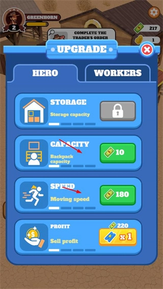 1、进入升级界面后,可消耗现金来提升角色的各项属性,像CAPACITY、SPEED等,以此提高农场的经营效率。