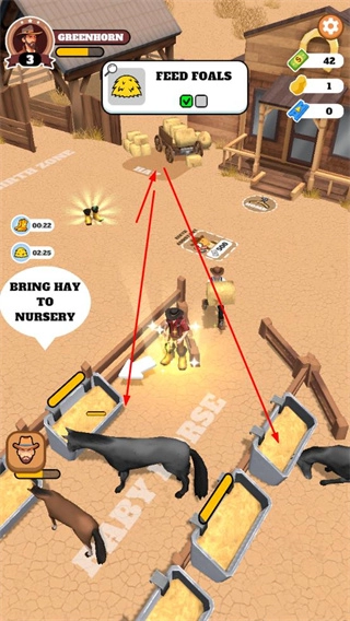 3、执行FEED FOALS任务,将干草投喂给小马驹,保障马匹成长,为后续经营奠定基础。