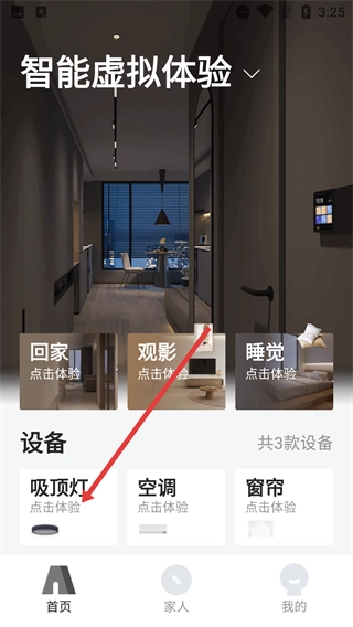 进入软件后,您可以体验【智能虚拟体验】中的不同场景,也能点击【设备】板块下的【吸顶灯】【空调】【窗帘】,选择对应的设备开启体验。