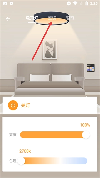 2、点击【吸顶灯】后,可操作【关灯】按钮,还能通过滑块调节【亮度】和【色温】,调整出心仪的灯光效果。