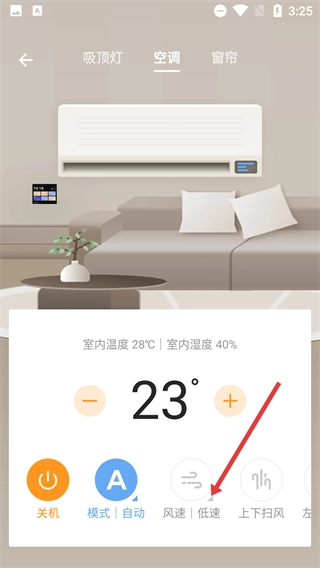 3、点击【空调】后,可设置温度,选择运行【模式】,点击【风速|低速】可进入风速选择界面切换风速。