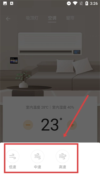 4、在空调风速界面,可选择【低速】【中速】【高速】中的任意档位,以此调节空调的送风速度,优化制冷制热体验。