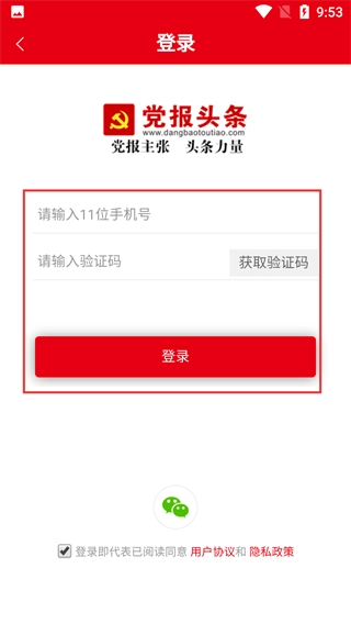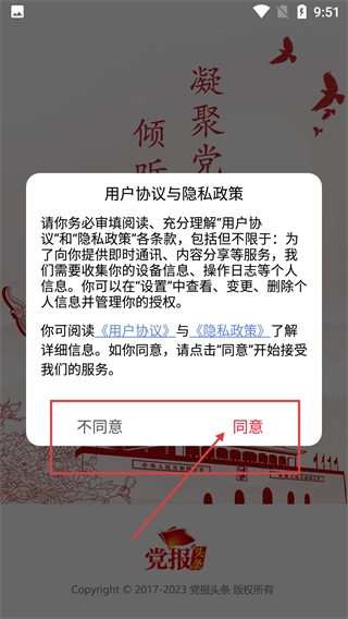 首次使用党报头条时,需点击【同意】按钮,在同意《用户协议》与《隐私政策》后,即可正常使用软件功能。