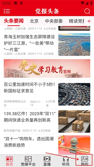 2、在党报头条首页,点击底部【我的】图标,进入个人中心页面。