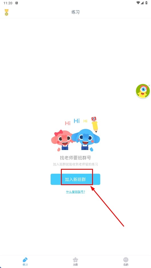 3、进入练习页面后,点击【加入新班群-功能按钮】,进入班群加入页面。