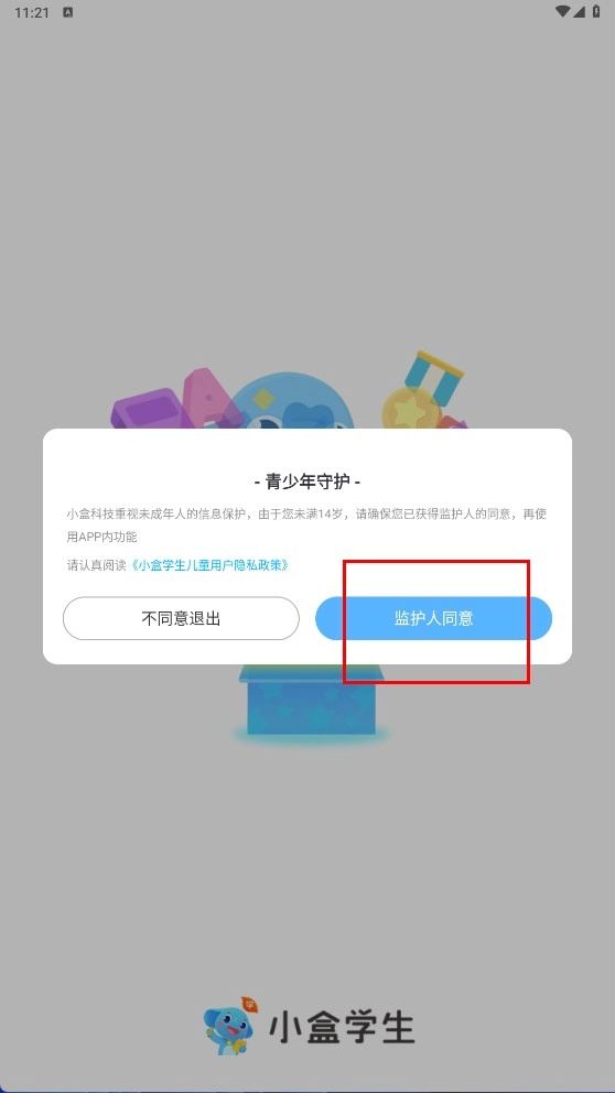 1、点击【监护人同意】功能按钮,即可进入小盒学生的登录注册页面。