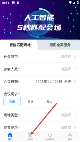 3、在【找场地】页面,依次选择【开会城市】【参会人数】【会议日期】等带*选项,完成智能匹配场地的信息填写。