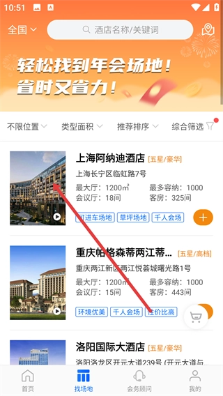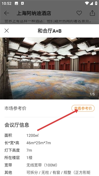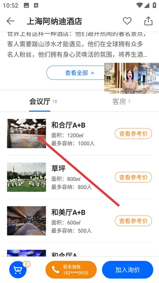 4、在场地列表中点击目标场地,进入其详情页后选择具体会议厅(如【和合厅A+B】),再点击【查看参考价】了解具体信息。