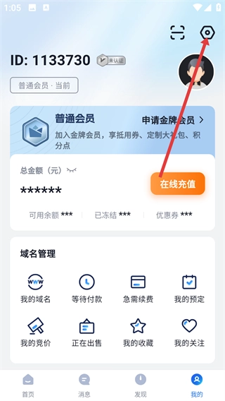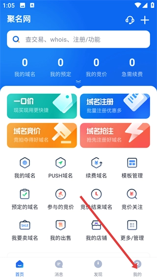 1、在聚名网首页点击右下角的【我的】按钮,进入个人功能页面,即可启动账号相关的操作流程。