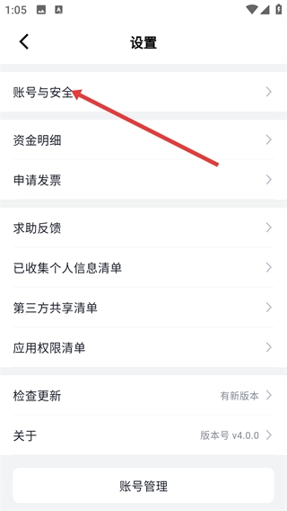 3、在设置页面点击【账号与安全】选项,进入账号安全管理页面。