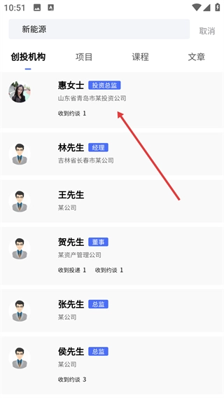 3、在搜索结果中选择目标创投机构人员,进入其详情页面。