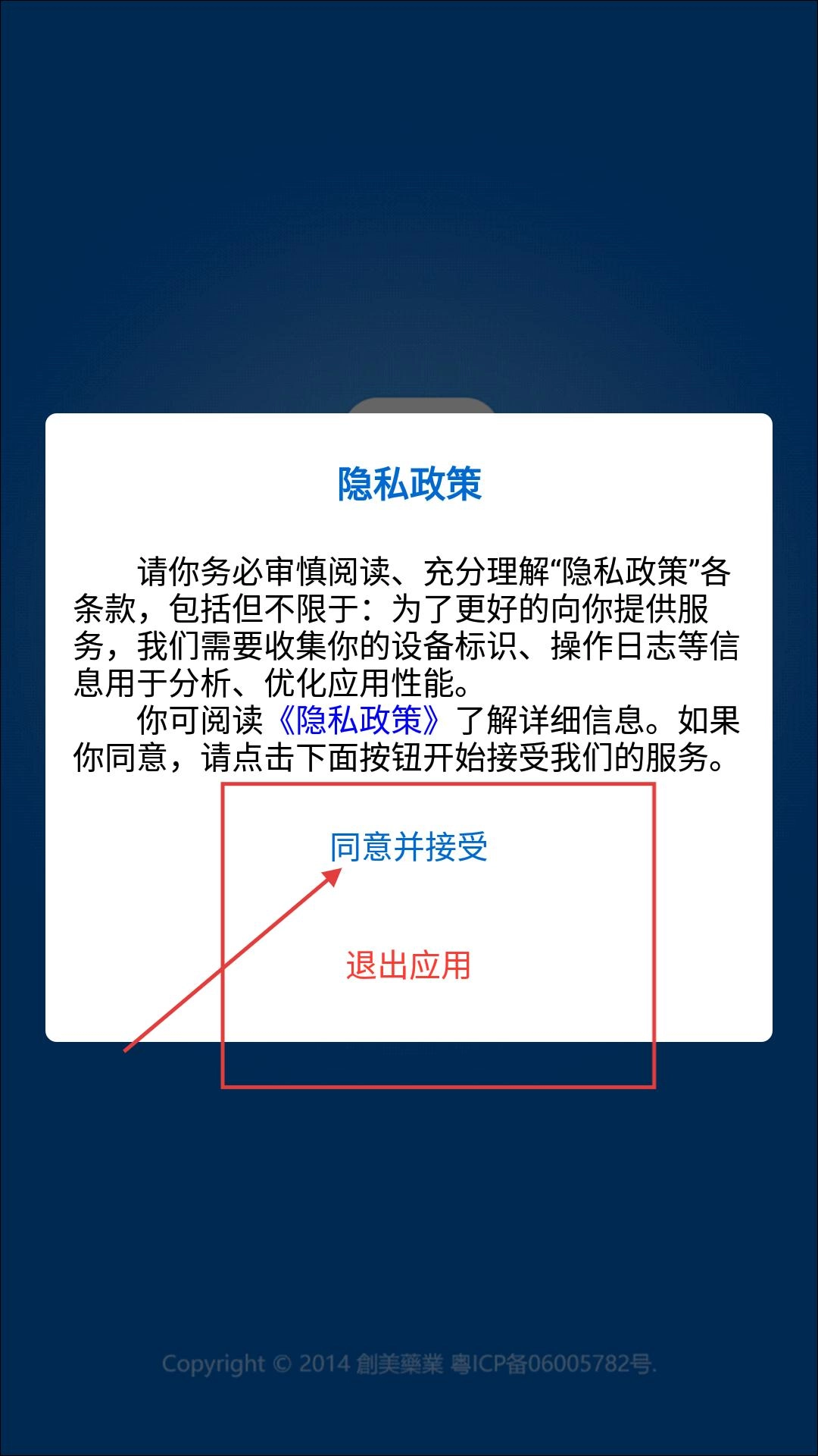 在隐私政策页面,要仔细阅读相关条款,若同意条款内容,可点击【同意并接受】按钮来继续使用服务;若不同意,则点击【退出应用】按钮。