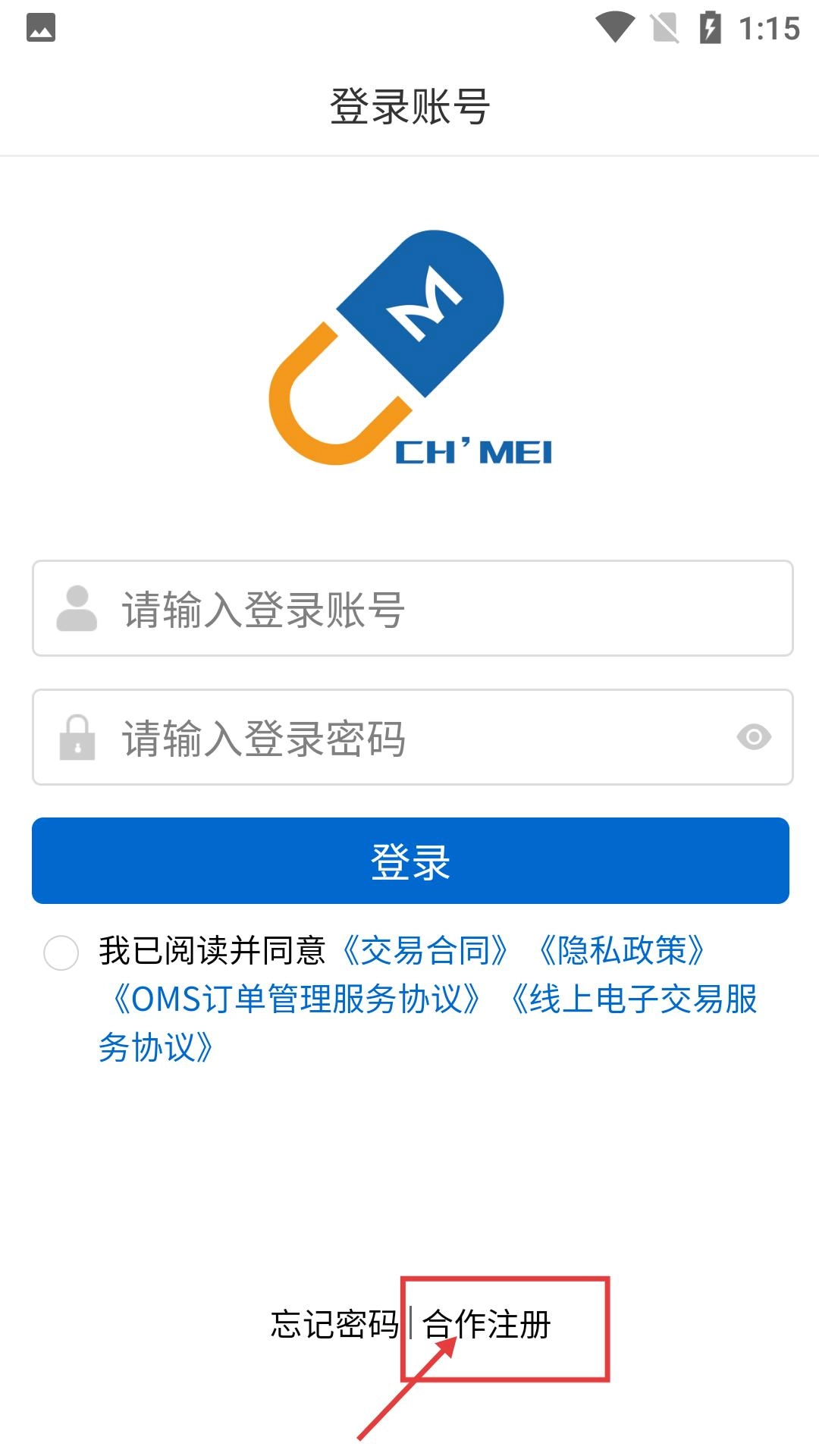 2、在登录账号界面,可输入账号、密码登录,也可点击【合作注册】创建账号,忘记密码可点击对应选项找回。