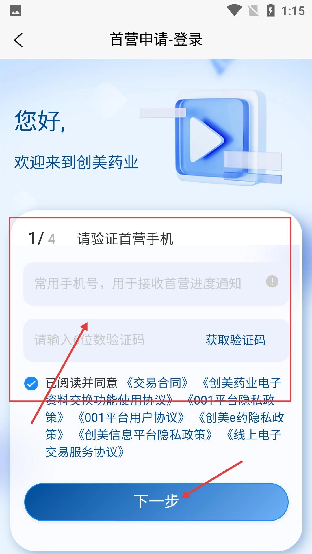 3、在首营申请-登录环节,需输入常用手机号获取并输入验证码,勾选同意相关协议后点击【下一步】。
