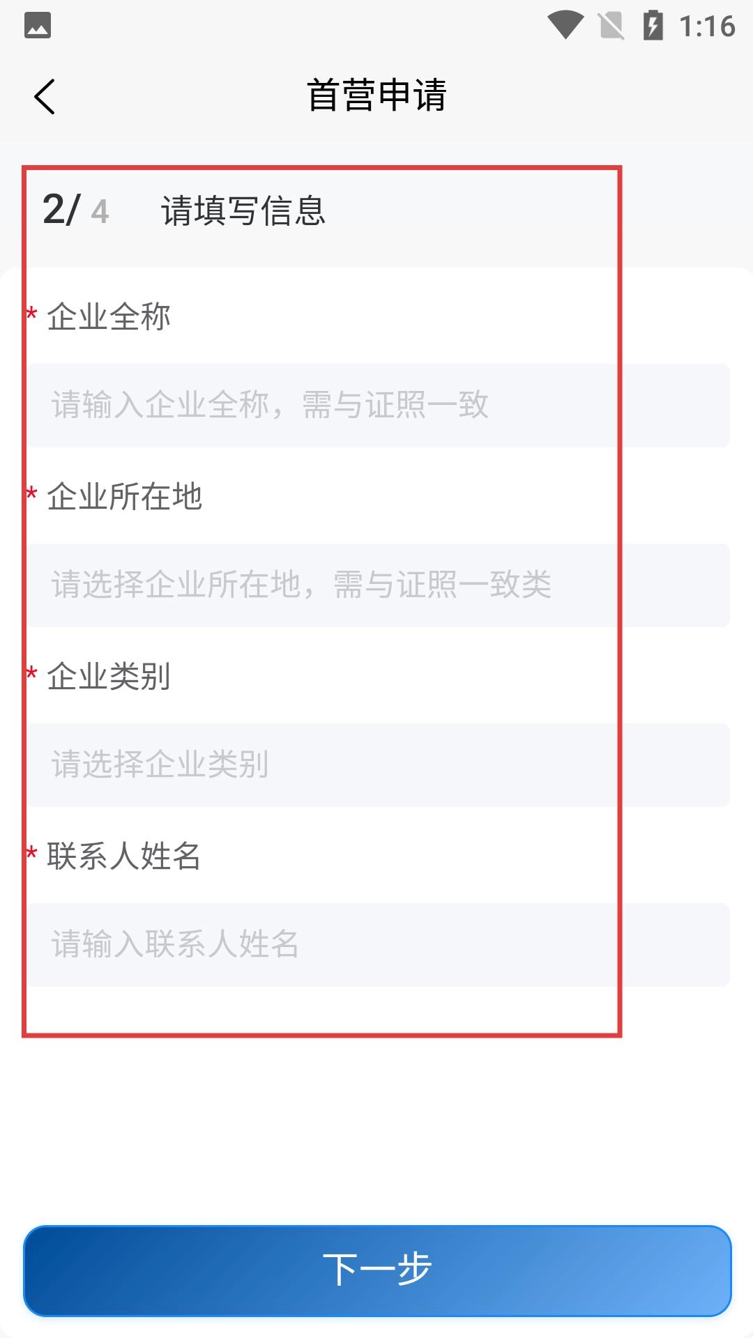 4、在首营申请的信息填写环节,需填写企业全称、所在地、类别及联系人姓名等必填信息,完成后点击【下一步】继续流程。