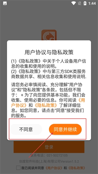 当弹出【用户协议与隐私政策】界面时,点击【同意并继续】按钮,即可继续使用该软件。