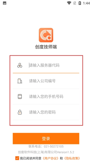 2、进入登录界面,依次输入【服务器代码】【公司编号】【手机号码】【密码】,完成后点击登录。