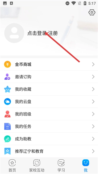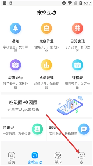 1、在【家校互动】页面点击底部的【我】,进入个人页面后,就能看到金币商城、我的收藏等功能选项。