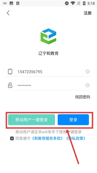 3、在登录注册界面,输入手机号和密码,勾选同意《和教育服务条款》《隐私政策》,准备登录。