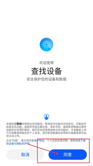 1、打开【查找设备】应用后,要先阅读服务说明,点击【同意】按钮就意味着同意《用户协议》,能够继续使用设备安全保护功能。
