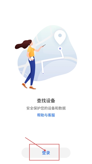 2、同意协议后进入功能页面,点击底部【登录】按钮,即可进入账号登录环节,该应用主要用于设备定位与数据安全保护。