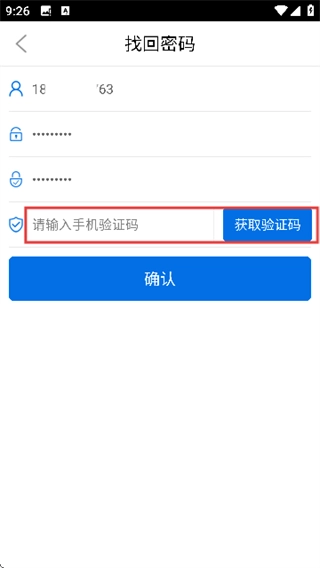 3、输入新密码并再次确认,然后点击【获取验证码】并输入手机验证码。