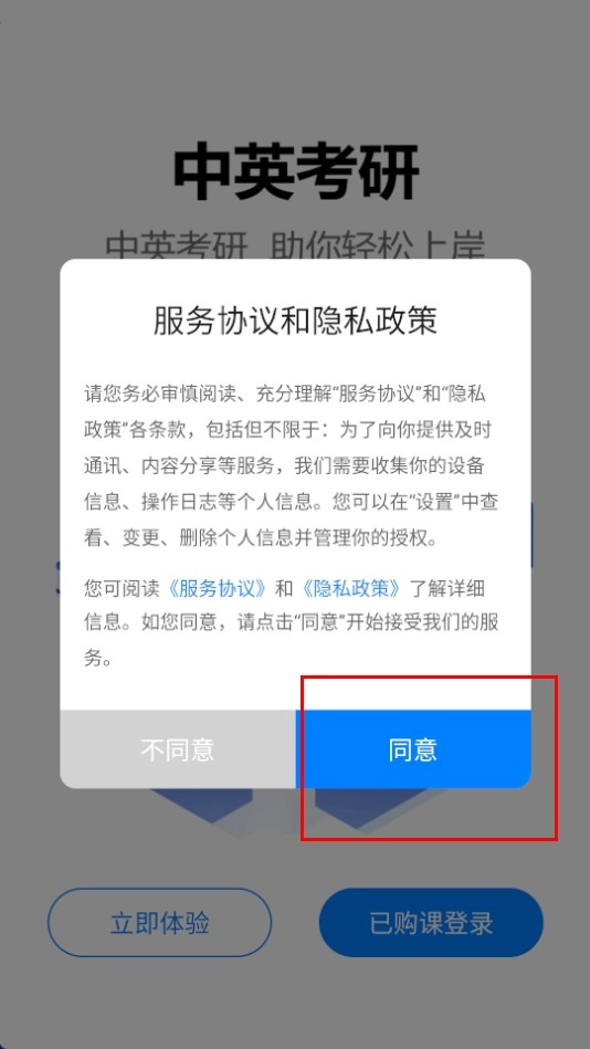 1、点击【同意-功能按钮】,以此确认服务协议与隐私政策。
