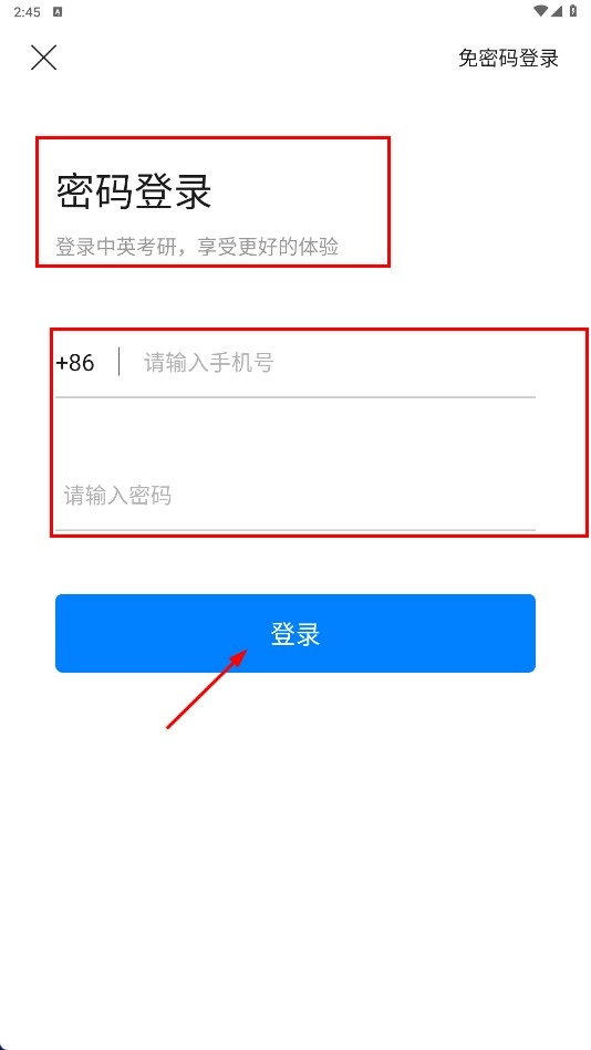 3、在密码登录页面,输入手机号和密码后,点击【登录-功能按钮】进入系统。